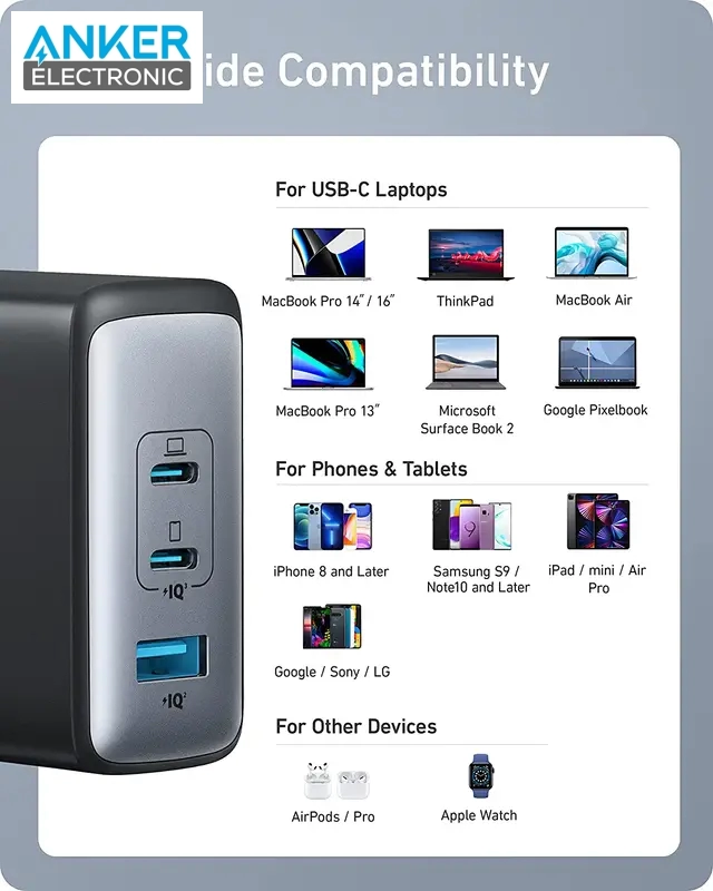 Anker 736 Charger (Nano II 100W) یک شارژر دیواری 3 پورت است که با فناوری GaN II و PowerIQ 3.0، شارژ سریع و ایمن را برای طیف وسیعی از دستگاهها از جمله لپتاپها، گوشیهای هوشمند و تبلتها ارائه میدهد. این شارژر با ابعاد و وزن کم، به عنوان یک همراه ایدهآل برای مسافرت و جابجایی به حساب میآید.