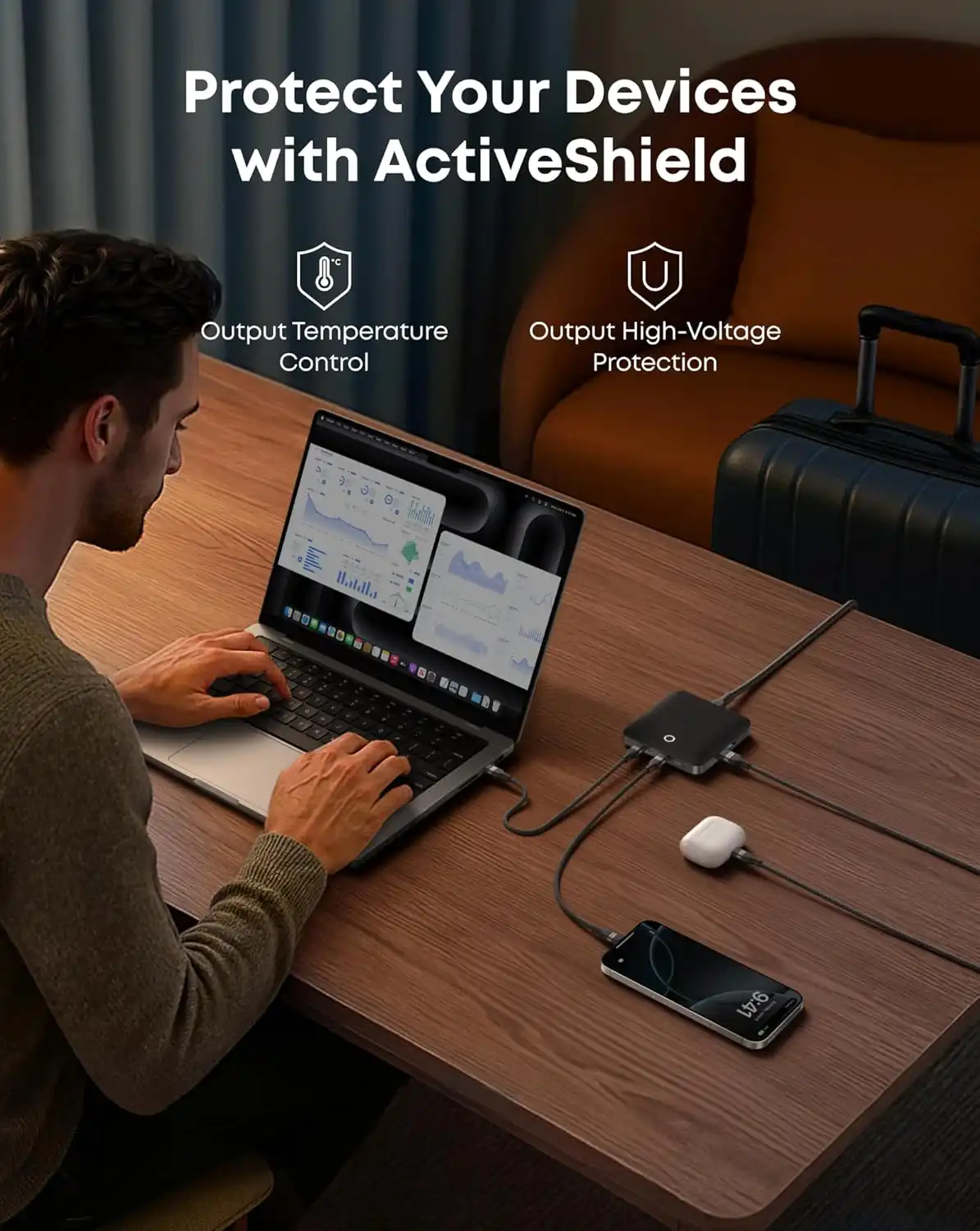 ایمنی شارژر و دستگاههای متصل، همواره یکی از اولویتهای اصلی انکر بوده است. شارژرهای پیشرفته این شرکت، مجهز به فناوری حفاظتی ActiveShield 2.0 هستند که یک سیستم ایمنی جامع و چندلایه است. این فناوری با نظارت لحظهای بر دما و پارامترهای شارژ، از دستگاههای شما در برابر خطرات احتمالی محافظت میکند. ActiveShield 2.0 به طور هوشمندانه دمای شارژر و دستگاه متصل را تا ۳ میلیون بار در روز بررسی میکند تا از افزایش بیش از حد دما جلوگیری کند.