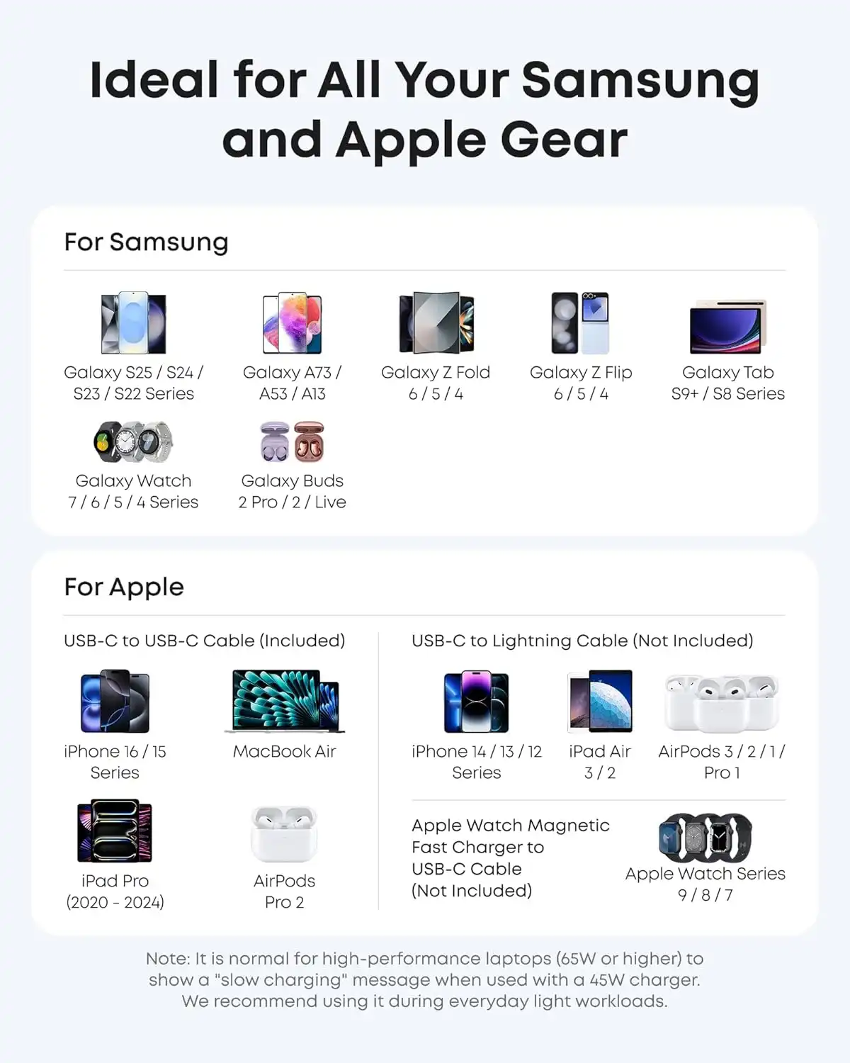 - توان بالا (45 وات): مناسب برای شارژ سریع انواع لپتاپهای کوچک، تبلتها و موبایلها.