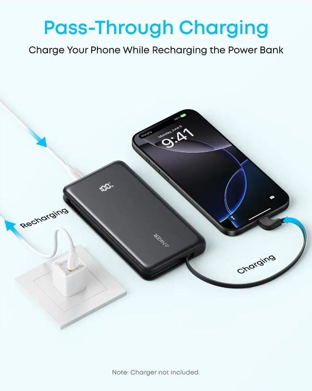تصور کنید در سفر هستید و همزمان باتری گوشی موبایل، هندزفری بلوتوثی و ساعت هوشمندتان رو به اتمام است. با اکثر پاوربانکهای معمولی، باید نوبت بگیرید و تکتک آنها را شارژ کنید. اما Anker A110D با قابلیت شارژ همزمان سه دستگاه، این مشکل را حل کرده است. شما میتوانید از کابل متصل USB-C برای گوشی، از پورت USB-C برای هندزفری و از پورت USB-A برای ساعت هوشمند خود استفاده کنید.