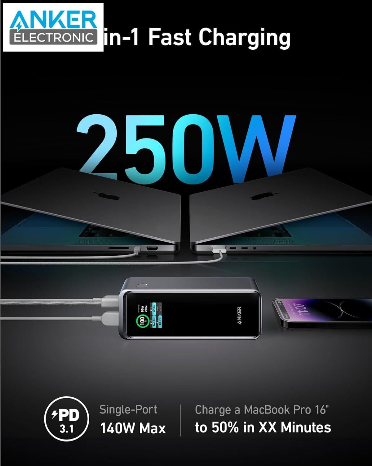 - توان خروجی 250 وات: با استفاده از فناوریهای Power Delivery 3.1 و PowerIQ 4.0، این پاوربانک میتواند دستگاههای شما را با سرعتی باور نکردنی شارژ کند. MacBook Pro 16 اینچی را تنها در 28 دقیقه تا 50 درصد شارژ کنید.