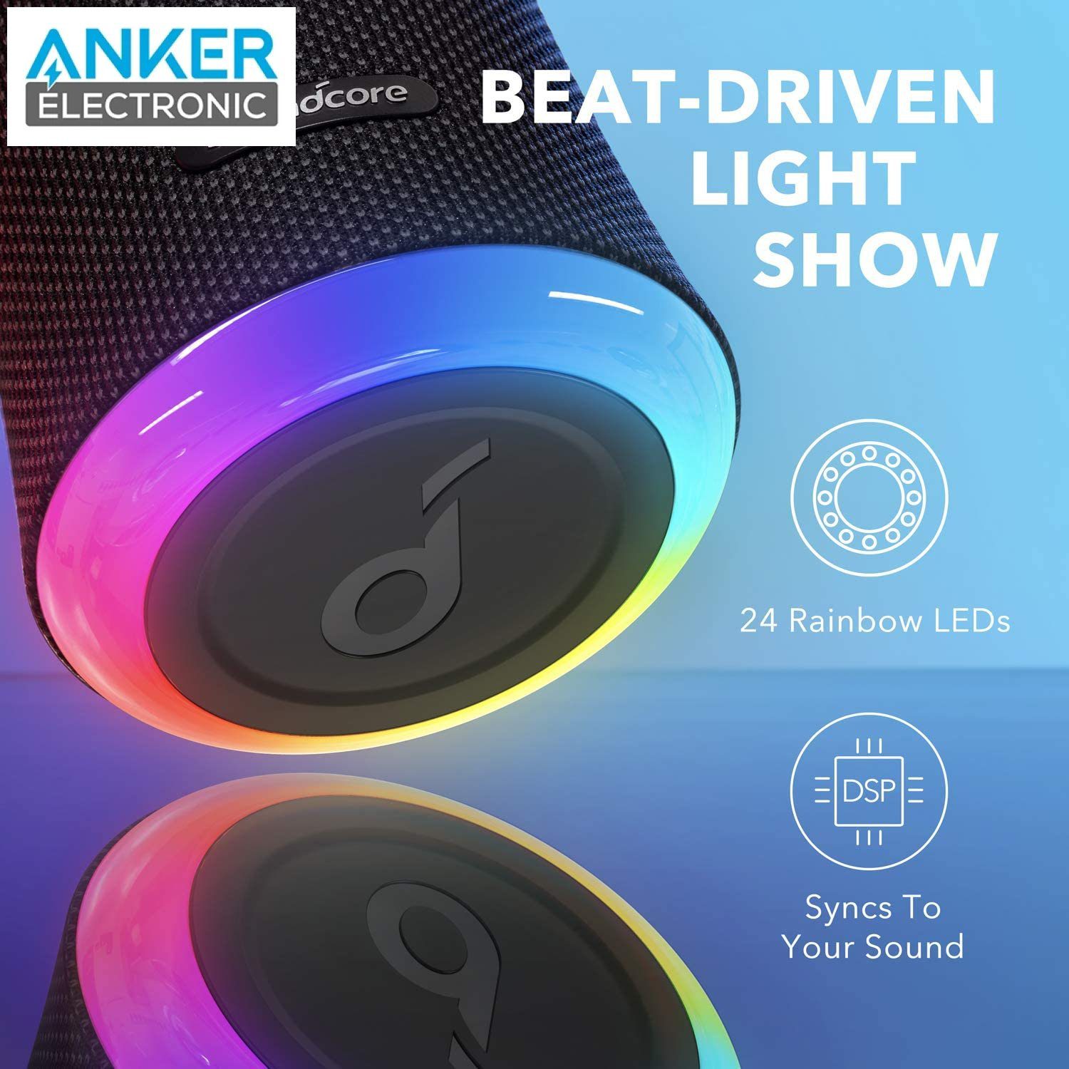 • مجهز به 24 عدد نوار LED رقص نور در بالا و پایین اسپیکر