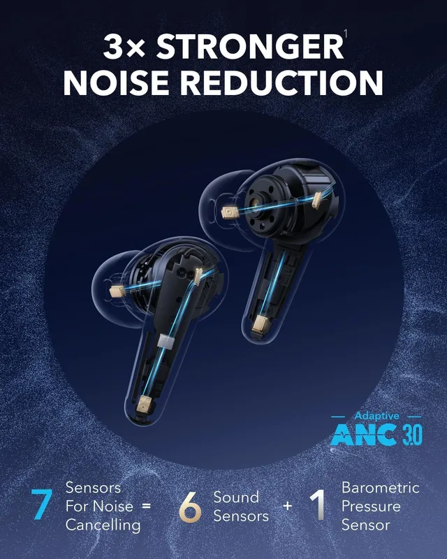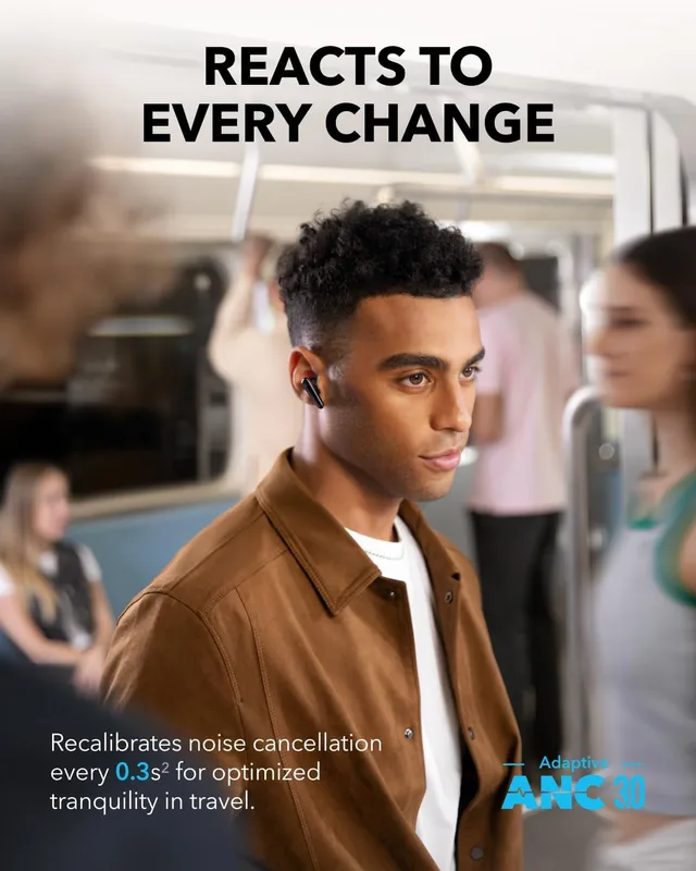• حذف نویز فعال (ANC) پیشرفته: با استفاده از فناوری Adaptive ANC 3.0، از شر سر و صدای محیط اطراف خلاص شوید و به دنیای موسیقی خود فرو بروید. این فناوری به صورت هوشمندانه نویزهای مختلف، از جمله صدای ترافیک، مکالمات و صداهای مزاحم دیگر را شناسایی و حذف می‌کند.