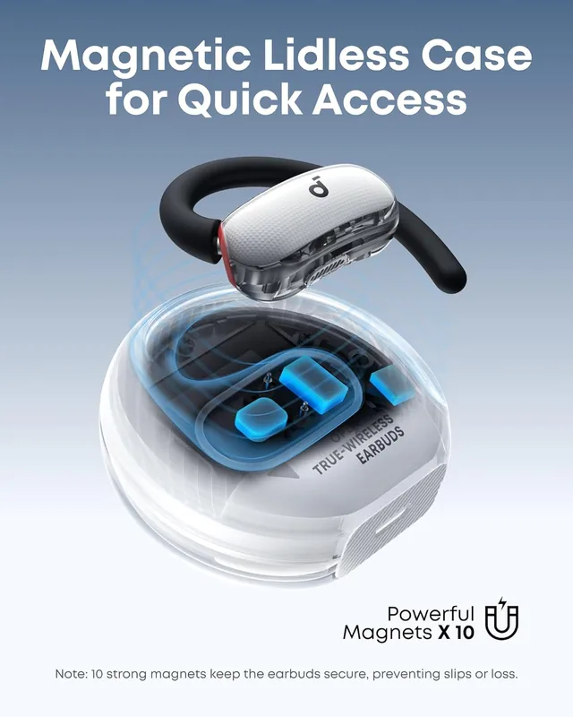 یکی از ویژگی‌های برجسته Soundcore V40i، تمرکز بر راحتی و ارگونومی فوق‌العاده است. این هدفون با طراحی Open-Ear (گوش‌باز)، انقلابی در تجربه استفاده از هدفون‌ها ایجاد کرده است. برخلاف هدفون‌های داخل گوشی سنتی که ممکن است پس از استفاده طولانی‌مدت باعث ایجاد فشار، خستگی یا ناراحتی شوند، V40i به گونه‌ای طراحی شده که هیچ گونه فشاری بر داخل گوش وارد نمی‌کند. این طراحی هوشمندانه، حس آزادی و راحتی بی‌نظیری را به ارمغان می‌آورد و به شما امکان می‌دهد تا ساعت‌ها بدون خستگی از هدفون استفاده کنید. این به معنای عدم وجود حس گرفتگی یا پر بودن گوش است، که امکان استفاده از هدفون را برای ساعات متمادی فراهم می‌کند. علاوه بر راحتی، این طراحی به شما اجازه می‌دهد تا همچنان از محیط اطراف خود آگاه باشید؛ خواه در حال پیاده‌روی در شهر باشید، در اداره کار کنید، یا در خانه به امور خود بپردازید، می‌توانید صدای موسیقی یا تماس خود را بشنوید و همزمان از صدای محیط اطراف نیز مطلع شوید. این ویژگی برای امنیت در فضای باز و حفظ ارتباط با اطرافیان بسیار مهم است.