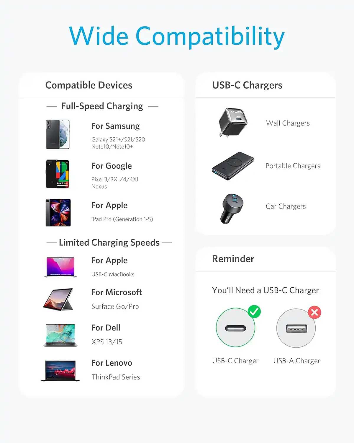 یکی از مهمترین ویژگیهای یک کابل USB-C، توانایی آن در ارائه شارژ سریع و انتقال داده با سرعت بالاست. کابل Anker A8753 در این زمینه عملکردی فوقالعاده از خود نشان میدهد. این کابل از فناوری فست شارژ تا ۶۰ وات پشتیبانی میکند. این توان بالا به شما اجازه میدهد تا علاوه بر گوشیهای هوشمند و تبلتها، لپتاپهای سازگار با پورت USB-C را نیز به سرعت شارژ کنید. به عنوان مثال، میتوانید گوشیهای هوشمند سامسونگ را به راحتی شارژ کنید، به طوری که طبق تستهای انجام شده، میتواند 55 درصد از باتری گوشیهای سامسونگ را تنها در ۳۰ دقیقه شارژ کند. این سرعت شارژ خیرهکننده، به خصوص در مواقعی که زمان کمی دارید، بسیار کاربردی است.