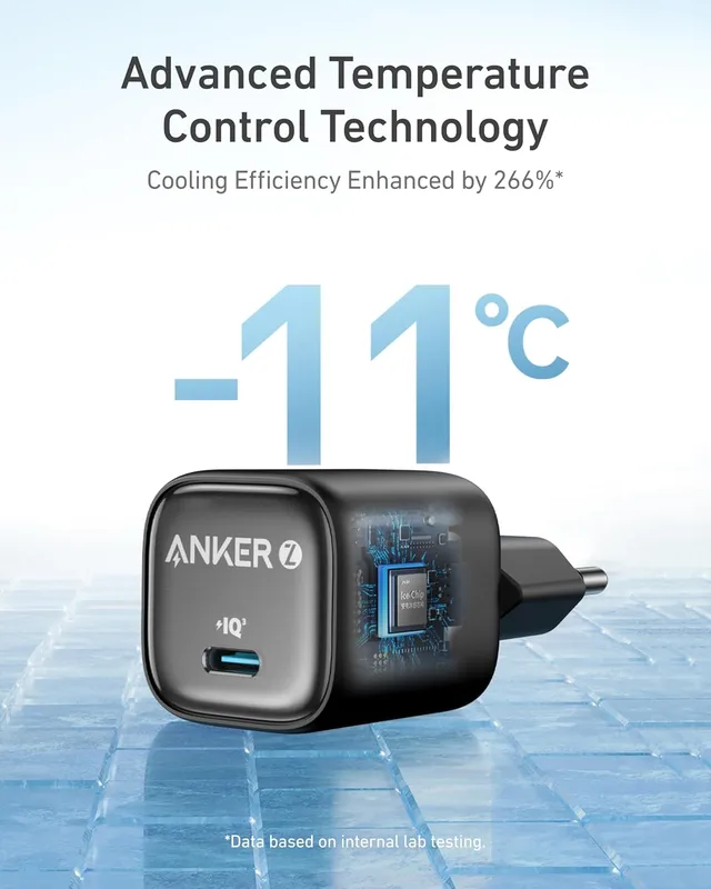 - نوآوری در مدیریت حرارت: یکی از نگرانیهای همیشگی در شارژرهای پرقدرت و کوچک، تولید گرما است. Anker با بهرهگیری از “Ice-Chip Technology” در این مدل، توانسته است این چالش را به خوبی مدیریت کند. این فناوری باعث میشود که شارژر حتی در اوج فعالیت، دمای خود را 11 درجه سانتیگراد پایینتر از استانداردهای ملی حفظ کند.