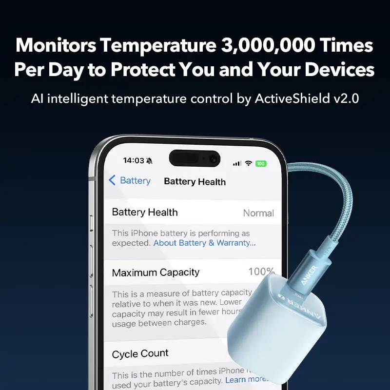 • نوآوری در مدیریت حرارت: یکی از نگرانی‌های همیشگی در شارژرهای پرقدرت و کوچک، تولید گرما است. Anker با بهره‌گیری از “Ice-Chip Technology” در این مدل، توانسته است این چالش را به خوبی مدیریت کند. این فناوری باعث می‌شود که شارژر حتی در اوج فعالیت، دمای خود را 11 درجه سانتی‌گراد پایین‌تر از استانداردهای ملی حفظ کند.