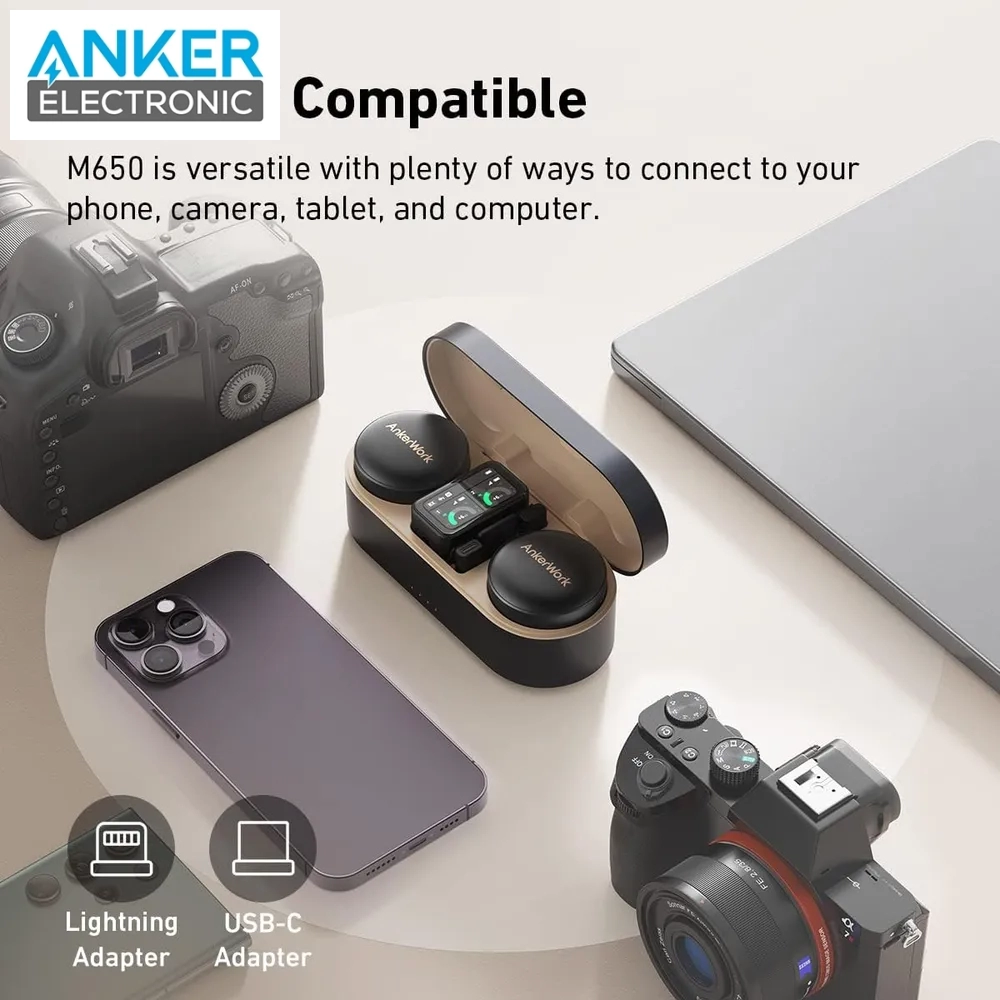میکروفون بی سیم AnkerWork M650 یک میکروفون همه کاره برای تولیدکنندگان محتوا است که به شما امکان می دهد به راحتی و سریع محتوای با کیفیت بالا ضبط کنید. این میکروفون دارای یک صفحه نمایش لمسی داخلی برای سفارشی سازی تنظیمات است و با لوازم جانبی Lightning و USB برای اتصال بدون دردسر به دوربین ها، تبلت ها و رایانه ها عرضه می شود.