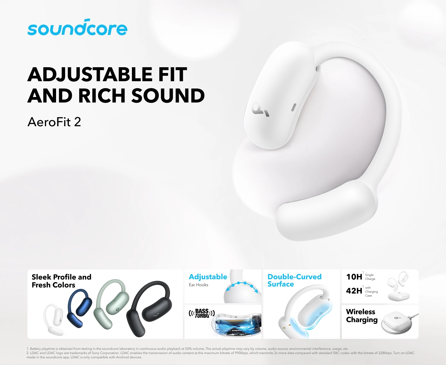 Soundcore AeroFit 2 به عنوان یک هدفون بیسیم با طراحی “گوش باز” جایگاه ویژهای در میان علاقهمندان به موسیقی و ورزش پیدا کرده است. در ادامه، به بررسی دقیقتر برخی از ویژگیها و مزایای این هدفون میپردازیم: