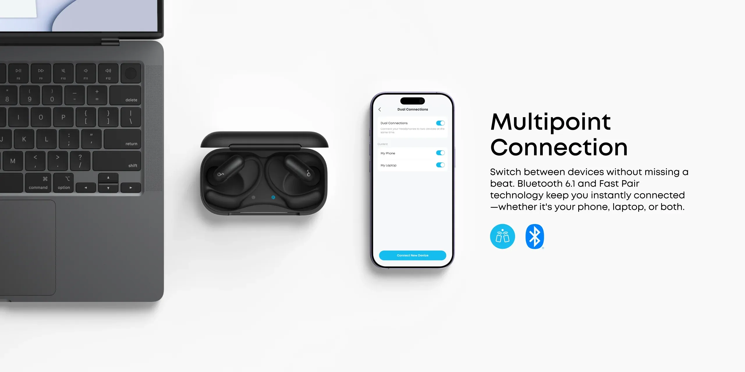 انکر این مدل را به آخرین نسخه تکنولوژی ارتباطی یعنی بلوتوث 6.1 مجهز کرده است. این نسخه نه تنها پایداری اتصال را به شکل چشمگیری افزایش داده و تاخیر صوتی (Latency) را به حداقل رسانده، بلکه قابلیت Multi-Point Connection را فراهم میکند. شما میتوانید به طور همزمان هدفون را به لپتاپ و گوشی موبایل خود متصل کنید؛ به طوری که اگر در حال تماشای فیلم روی لپتاپ هستید و تماسی دریافت کردید، هدفون به صورت خودکار روی گوشی سوئیچ میکند.
