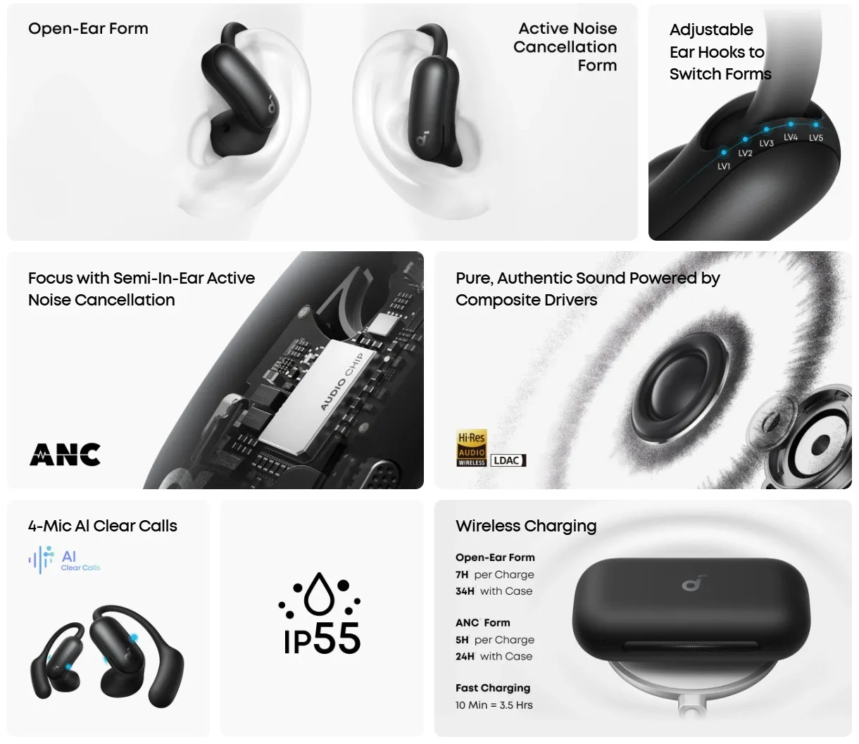وقتی صحبت از کیفیت صدا به میان میآید، انکر با دریافت تاییدیه Hi-Res Audio برای این مدل، خط بطلانی بر این باور کشید که هدفونهای گوشباز کیفیت پایینی دارند. پشتیبانی از کدک صوتی LDAC به این معناست که دادههای صوتی با نرخ انتقال تا 990 کیلوبیت بر ثانیه منتقل میشوند؛ یعنی تقریباً سه برابر بیشتر از کدکهای معمولی بلوتوث. این موضوع باعث میشود جزئیات موسیقی، از زیرترین صداها تا عمیقترین بیسها، با وفاداری کامل به نسخه اصلی استودیویی به گوش شما برسد.