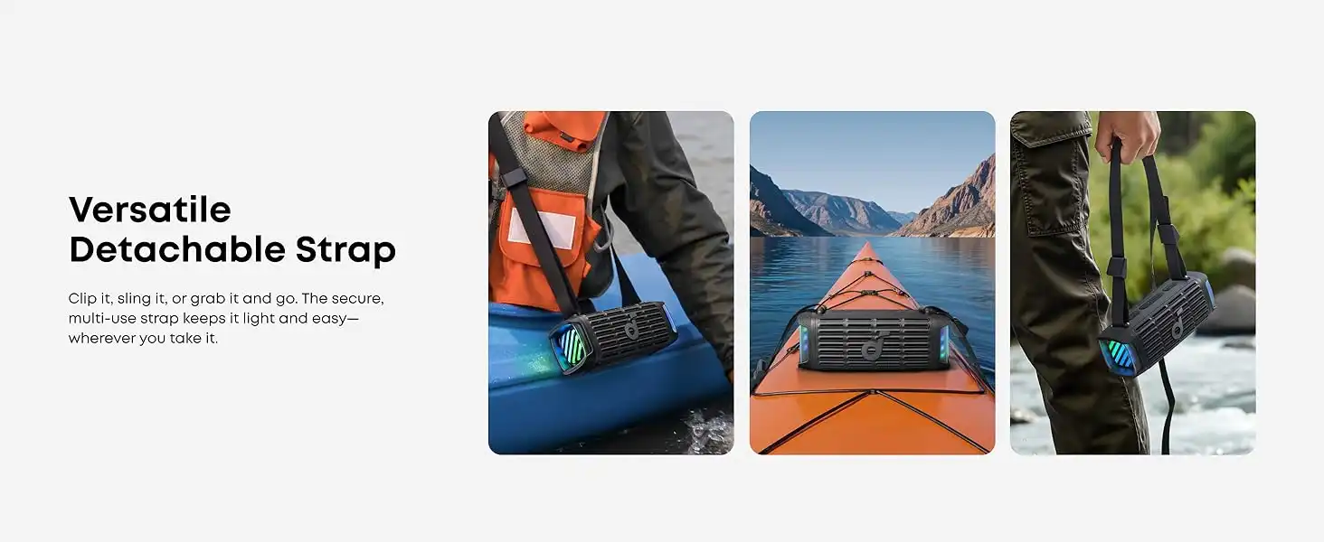 طراحی این مدل به وضوح بر کاربری در محیطهای خارجی (Outdoor) متمرکز است. برای تکمیل این هدف، Soundcore Boom 3i همراه با بند مخصوص با قابلیت تنظیم سایز عرضه میشود. این بند قابل تنظیم، حمل اسپیکر را در هنگام پیادهروی، کوهنوردی یا دوچرخهسواری فوقالعاده آسان میکند و میتوانید آن را به سادگی به شاخه درخت، فرمان دوچرخه یا کولهپشتی خود آویزان کنید. این طراحی هوشمندانه، Boom 3i را از یک اسپیکر معمولی به یک همراه همهکاره تبدیل میکند. ابعاد و وزن آن نیز به گونهای بهینهسازی شده تا علیرغم توان خروجی بالا، همچنان به عنوان یک دستگاه قابل حمل (Portable) شناخته شود.